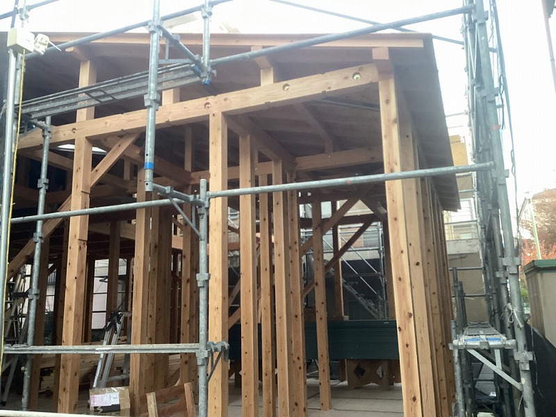 柱、梁で骨格が出来たことにより、家の形が見えてきました。
